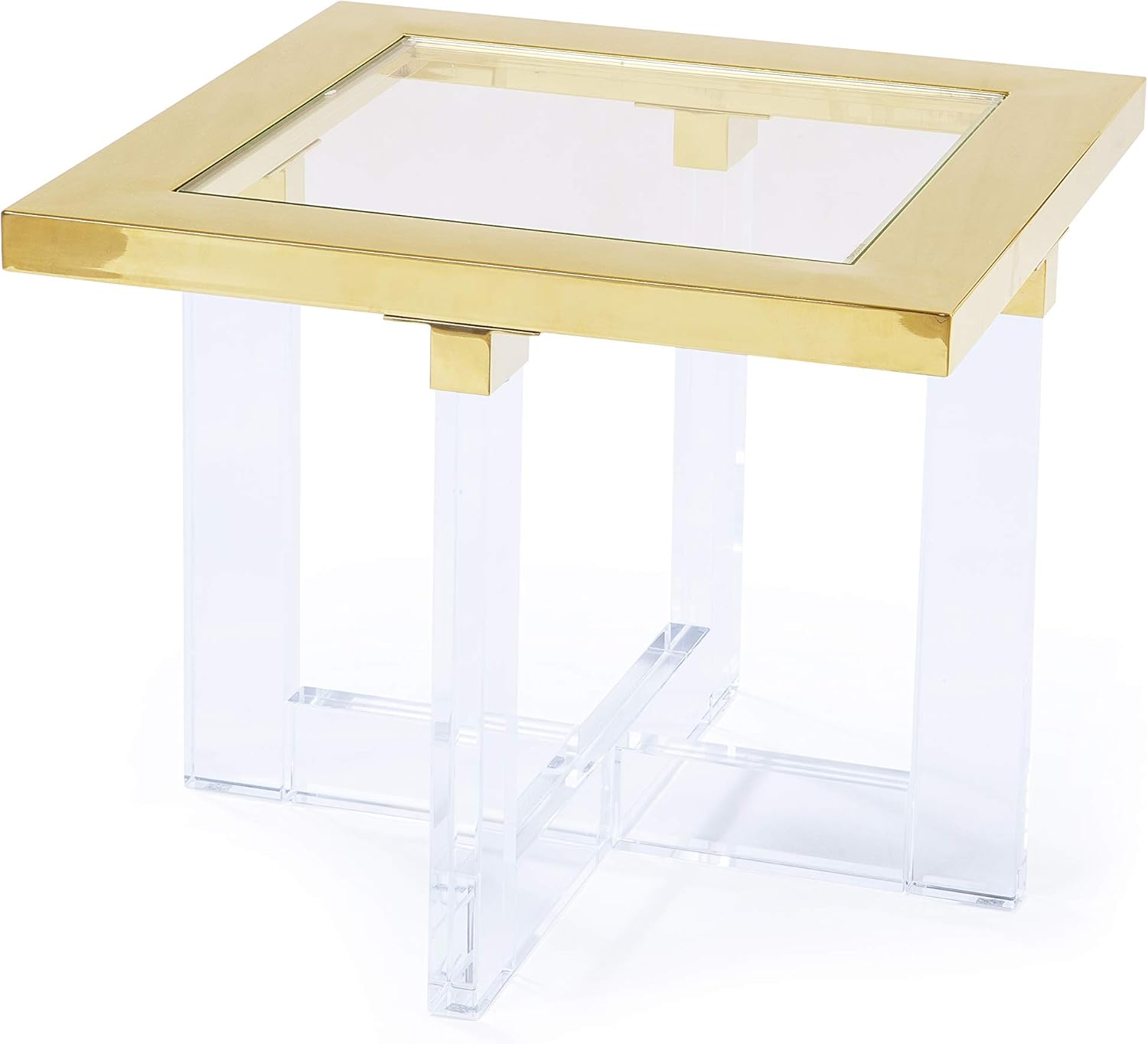 Vintage charles hollis jones brass, glass and lucite accent side table c. 15.75'' w x 11'' l x 2'' h. The base of the table is also metal and in a chrome finish. 55 downing street tustin 21 1/2 square clear lucite acrylic end table. The accent table features an oval, glass table top that is supported by a metal base.